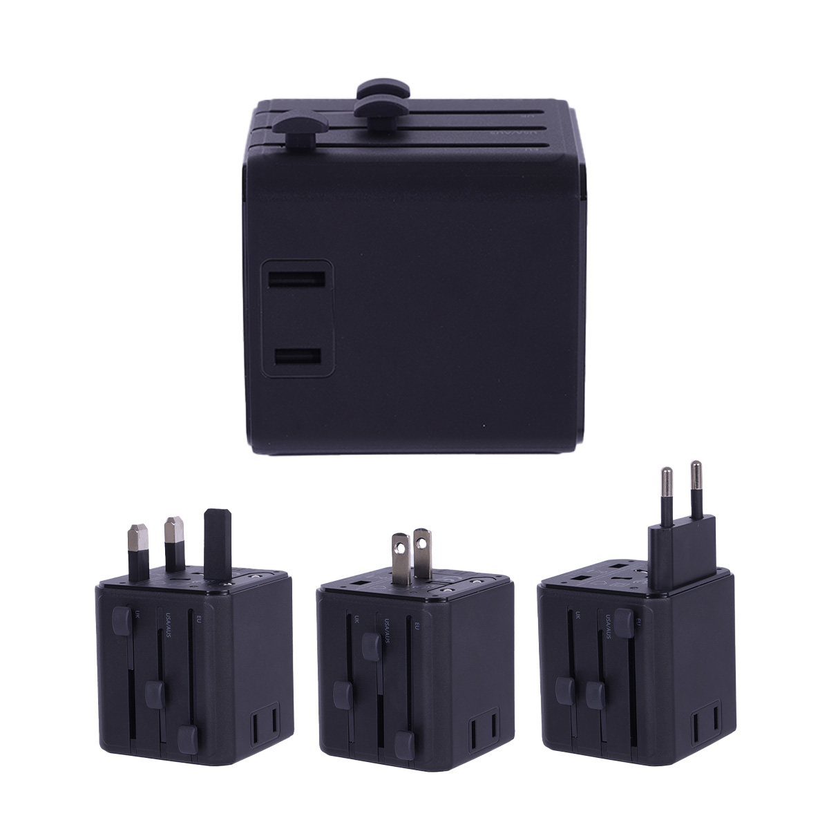 - Four integrated plug types cover US/AUS, UK, EU, and Asia for worldwide compatibility