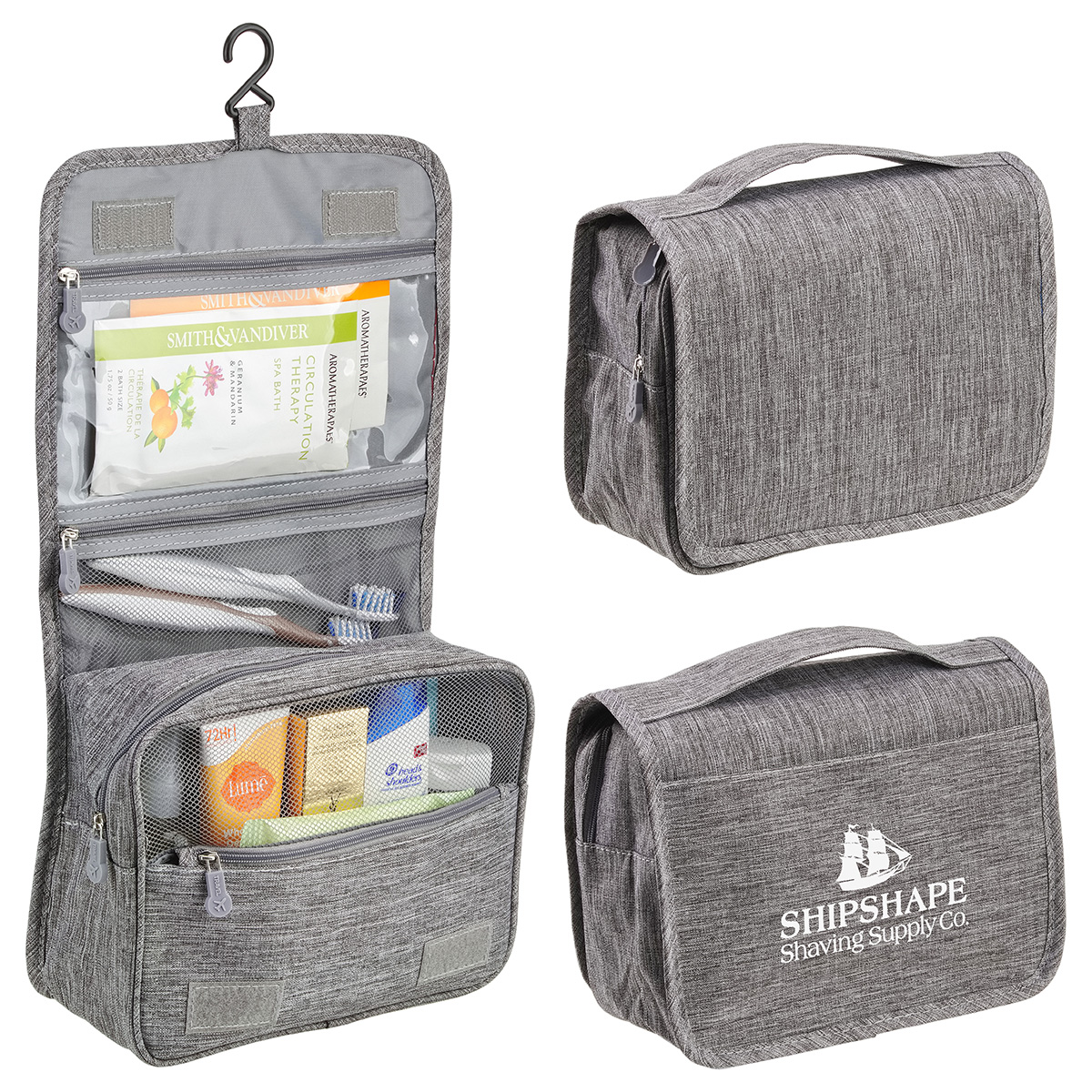- Organize and pack with our 300D heathered polyester Carry-all Toiletry Bag