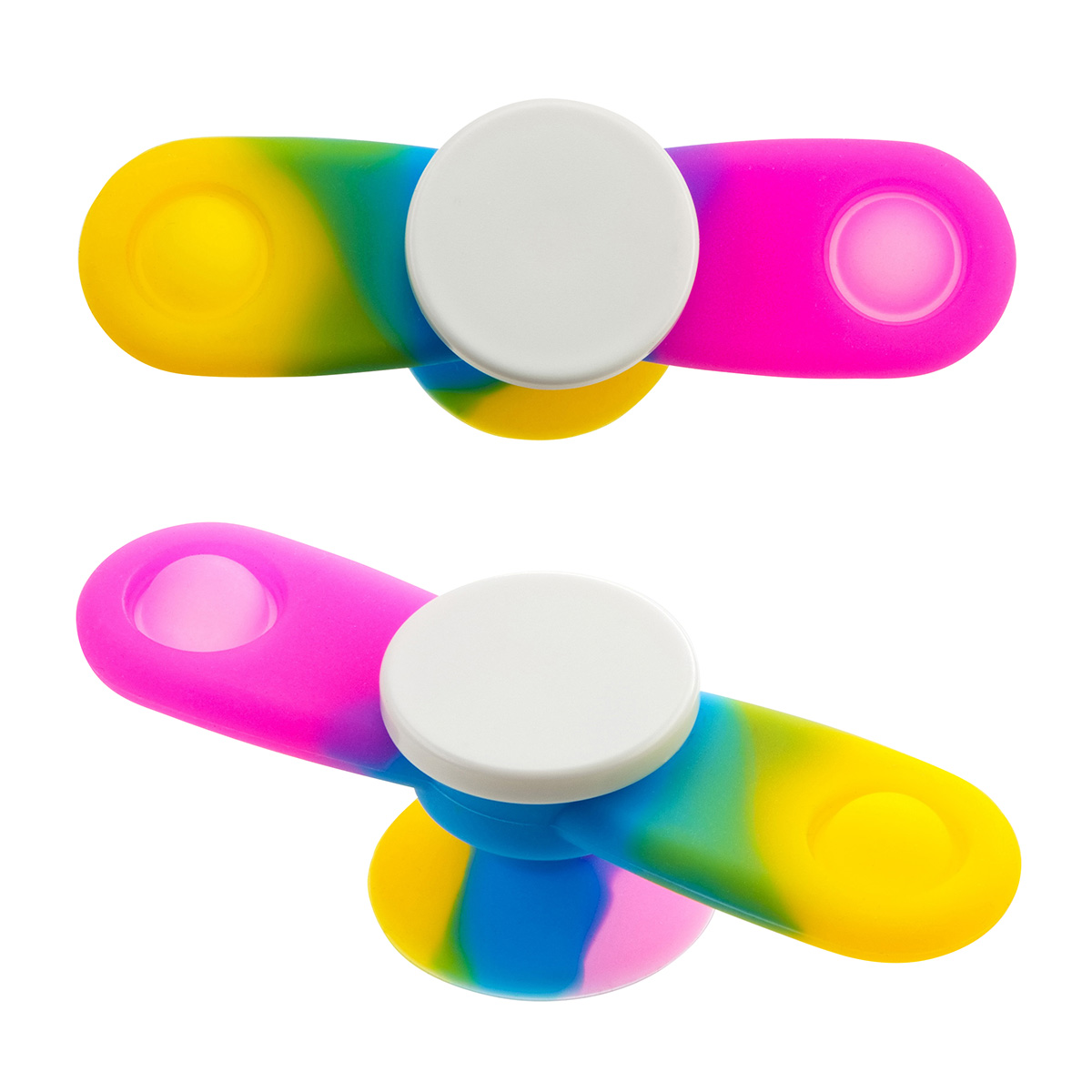 - Dual-function fidget combines spinning action and pop-it sensory play
