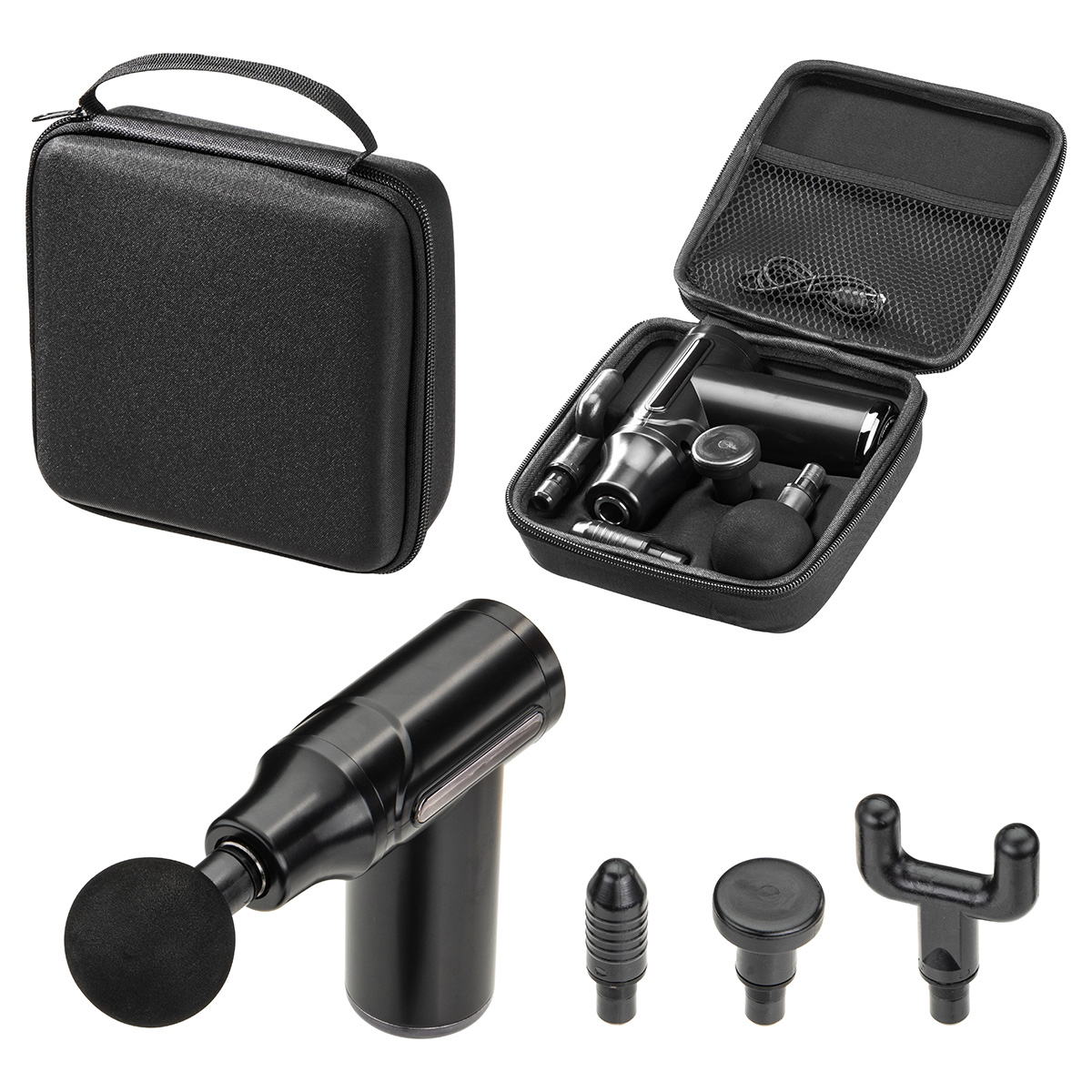 - Crimson Massage Gun with 4 interchangeable massage heads in a fabric zipper pouch