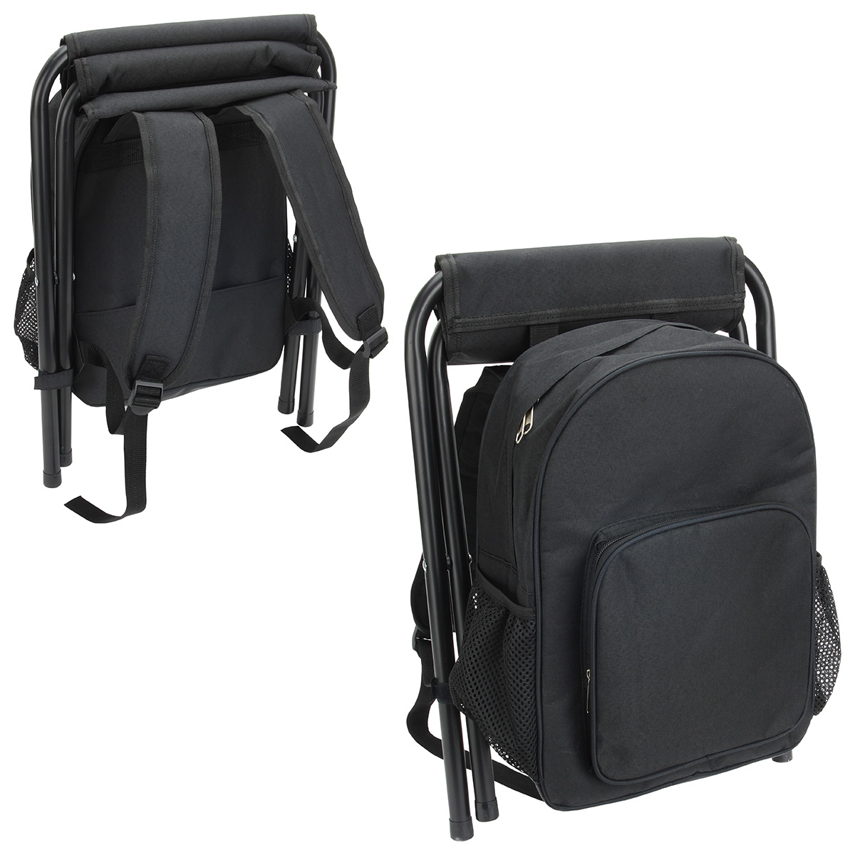 - Folding stool is attached/detached with metal snaps by shoulder straps