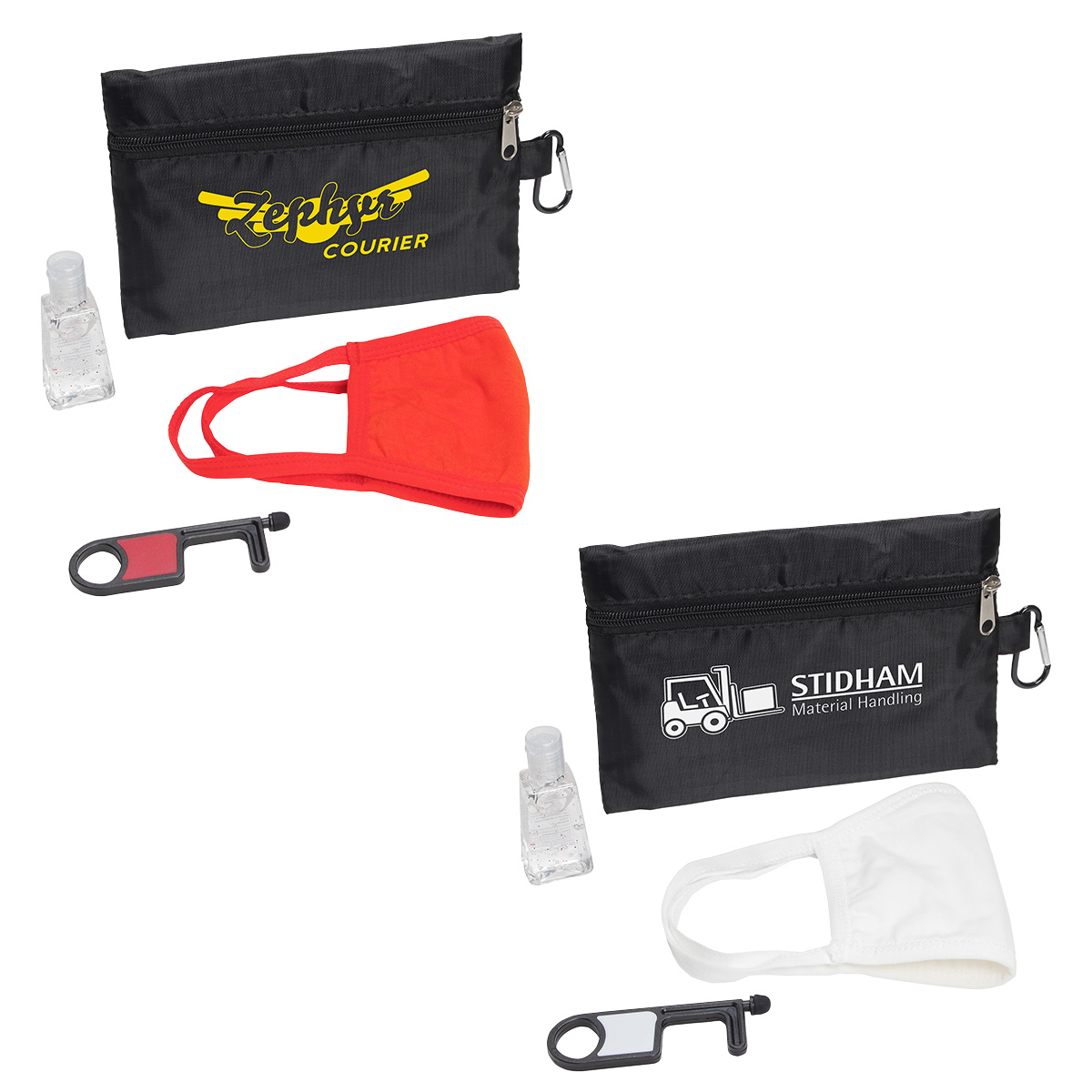 Kit includes: * (1) Reusable Cotton 4-Ply Face Mask * (1) No-Touch Tool with Stylus * (1) 1 oz Gel Hand Sanitizer (62% ethyl alcohol)