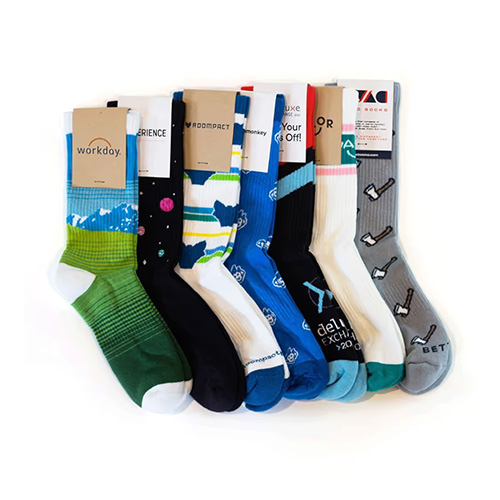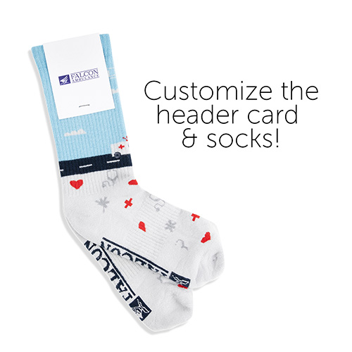 - Pricing includes custom woven socks and a full-color printed header card for added branding impact