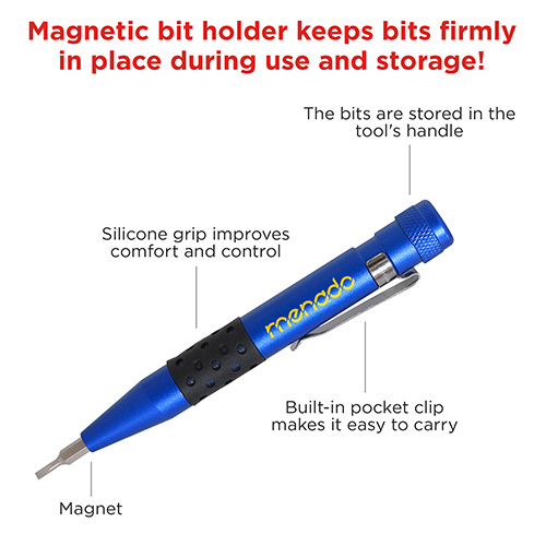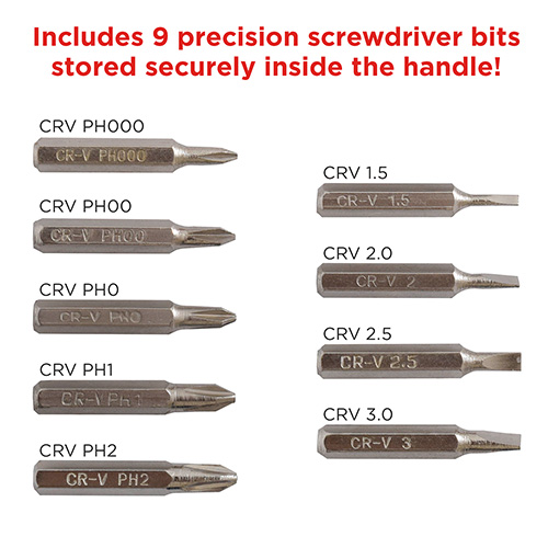 • Includes 9 precision screwdriver bits stored securely inside the handle